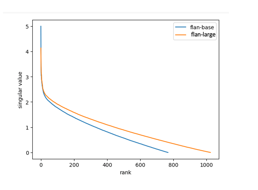 The above plot shows the singular value decay pattern of the learned weight matrices from flan-t5-base and flan-t5-large. The above plot shows a much faster spectrum decay pattern than a linear decline, reinforcing our hypothesis that Large Language Models have intrinsic low rank.