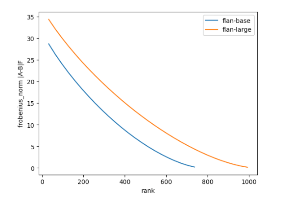 The above plot shows Frobenius norm of difference between attention Query weight matrix of decoder’s last layer and it’s approximation from low rank decomposition (r varies from 32 to 768 for flan-t5-base and 32 to 1024 for flan-t5-large)