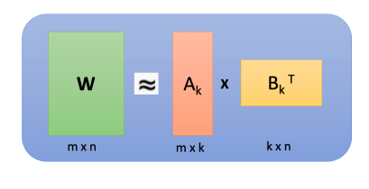 In the above image a m x n weight W is decomposed into m x k matrix A and k x n matrix B. In linear algebra, the rank[6] of a matrix W is the dimension of the vector space generated by its columns. This corresponds to the maximal number of linearly independent columns of W. Over parametrized weight matrices can contain linearly dependent columns, hence they can be decomposed into product of smaller matrices.