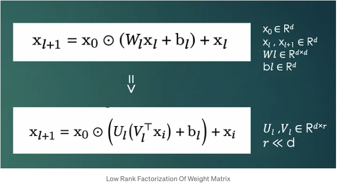 maintaining the accuracy. To tame inference time latency, low rank decomposition of weight matrices have earlier been used in applications like DCN V2[5].