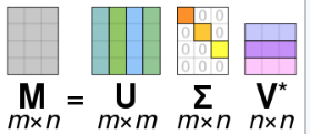 For a m x n matrix M, SVD factorizes M into orthonormal matrices U and V. V* is the conjugate transpose of V. is a diagonal matrix with non-negative real numbers on the diagonal.